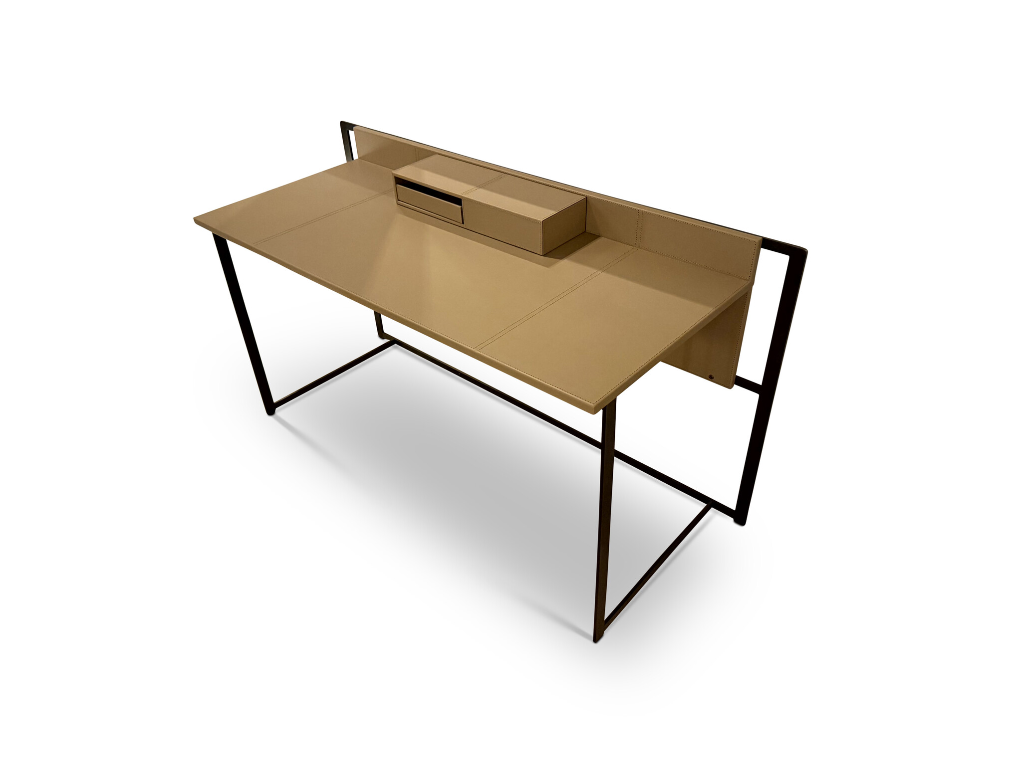 Stilvoller Schreibtisch in warmem Beigeton, bezogen mit Mikroleder und feinem Patchwork. Ein echter Blickfang mit luxuriöser Ausstrahlung.