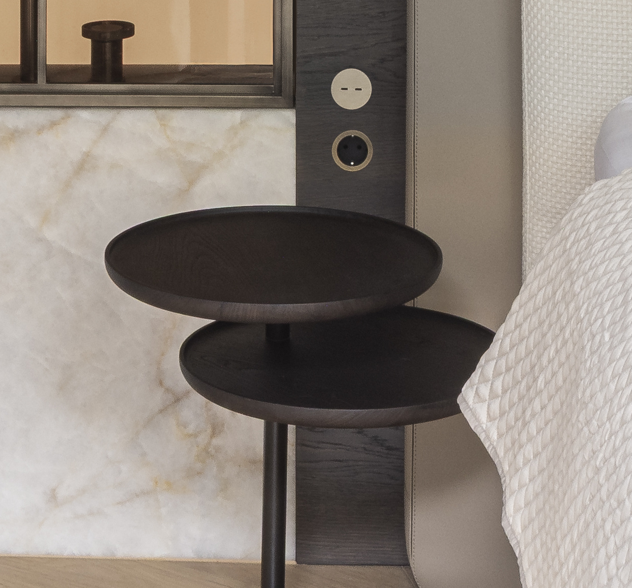 CHLOE end table, this stylish table combines a bronze finish with black-stained oak tops. Thanks to the swivel system, you can easily adjust the tops, ideal for a flexible and refined interior.