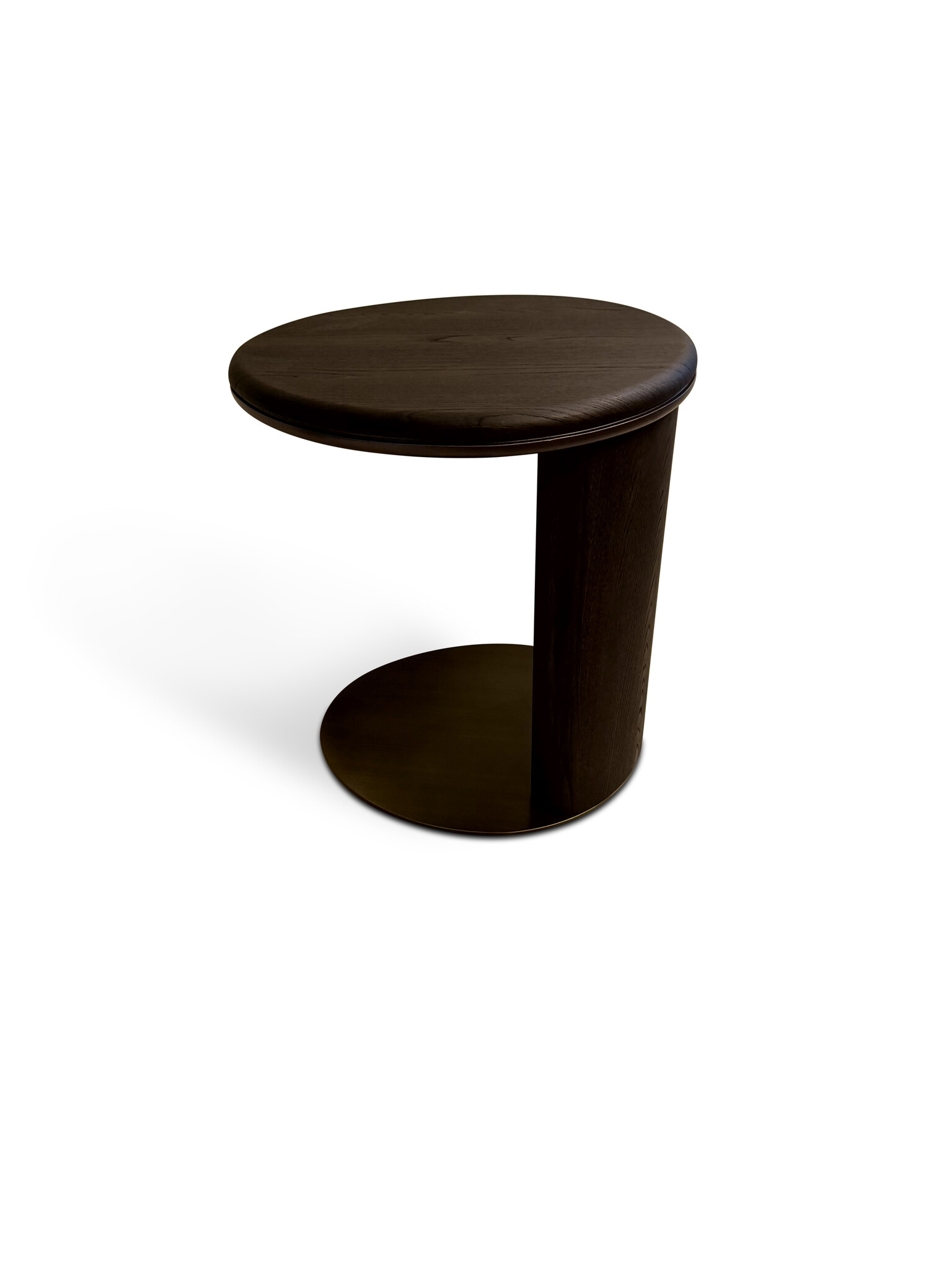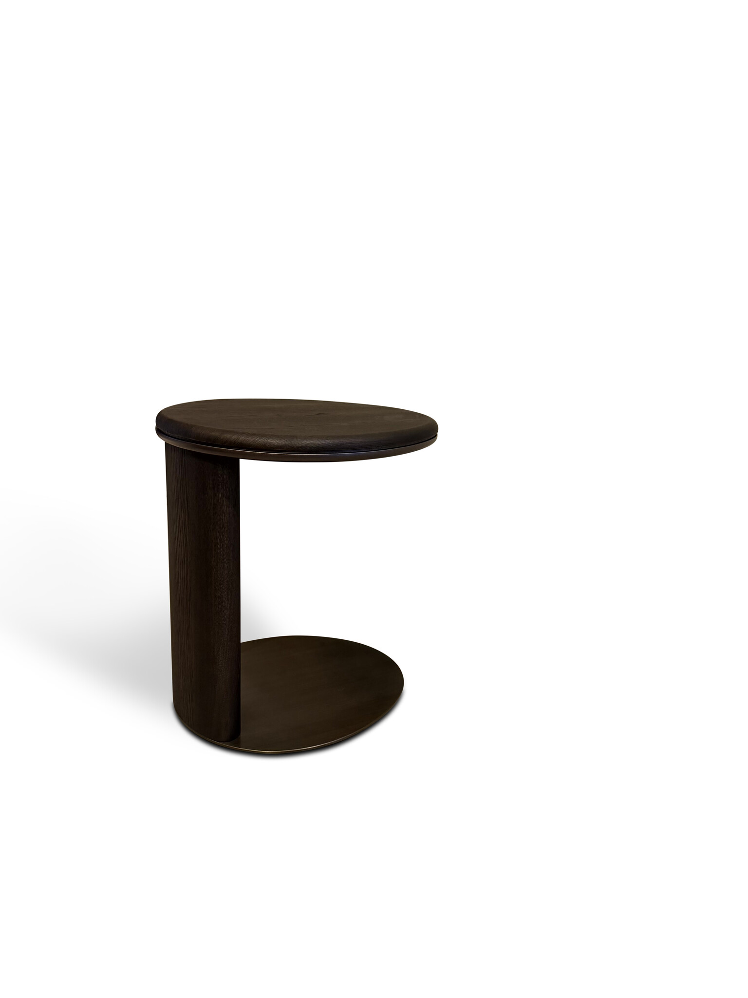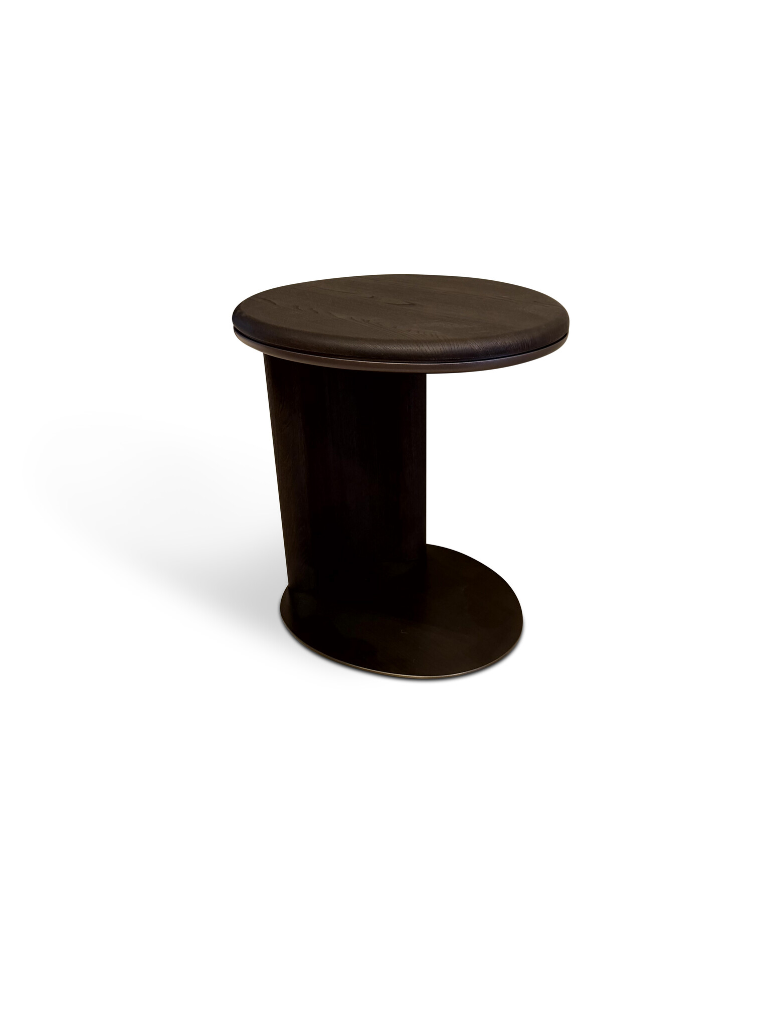 The U side table combines refined craftsmanship with a modern silhouette. The round tabletop is crafted from smoked black oak, allowing the natural wood grain to subtly show through. The table rests on an elegant bronze base.