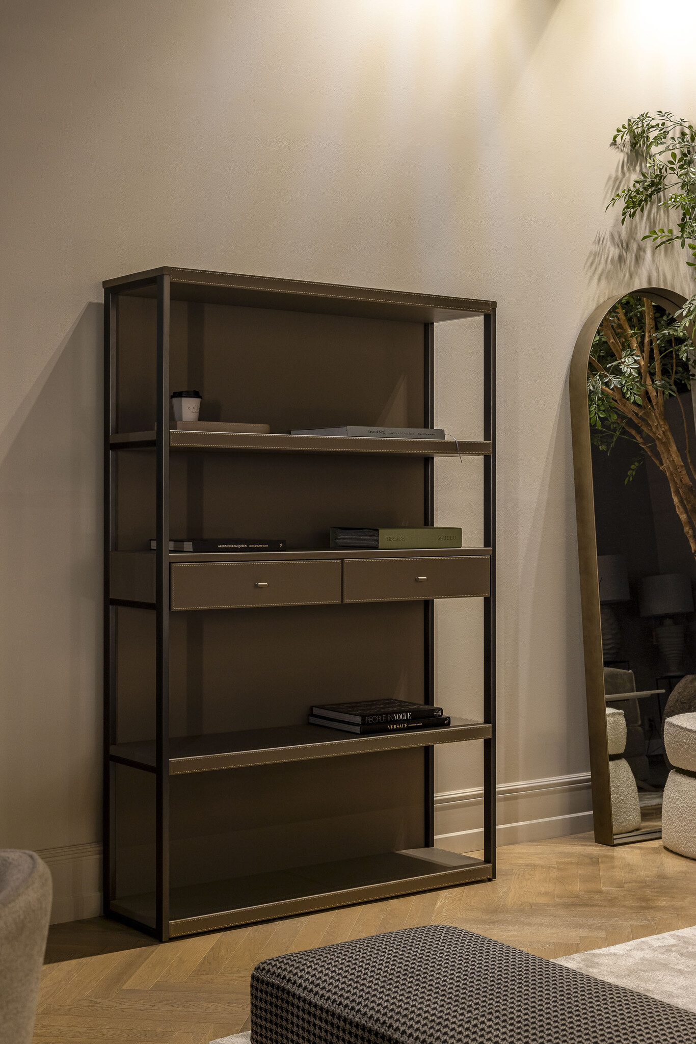 Sleek, modern, and refined , the NEW YORK Bookshelf in Etoupe Micro Leather adds understated luxury to any space. Wrapped in durable, soft-touch leather in a versatile taupe-gray tone, it blends minimalist design with premium materials.