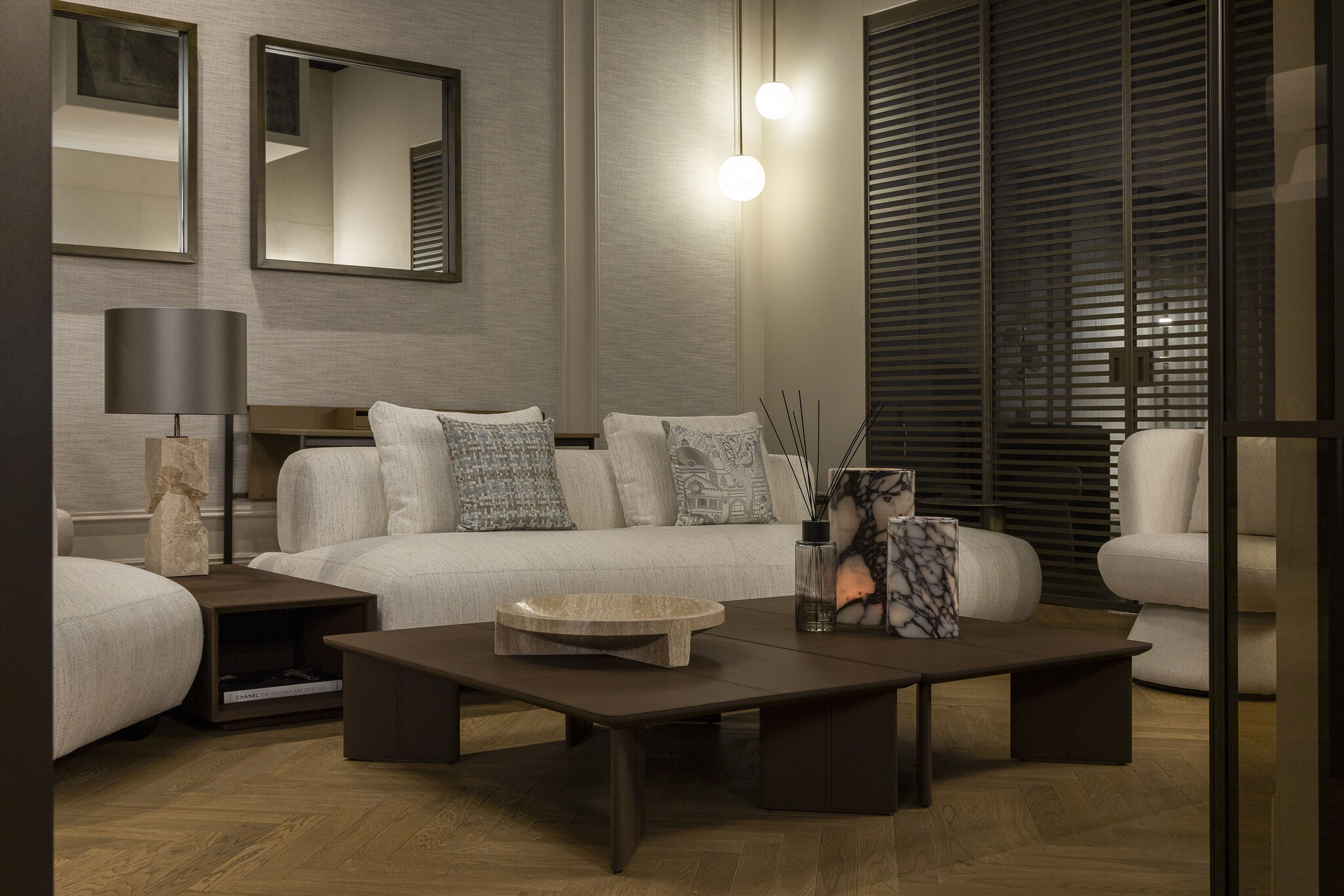 Stijlvolle salontafel met een warme bruine kleur, afgewerkt in microleer en verfijnd patchwork. Een echte blikvanger met een luxe uitstraling.