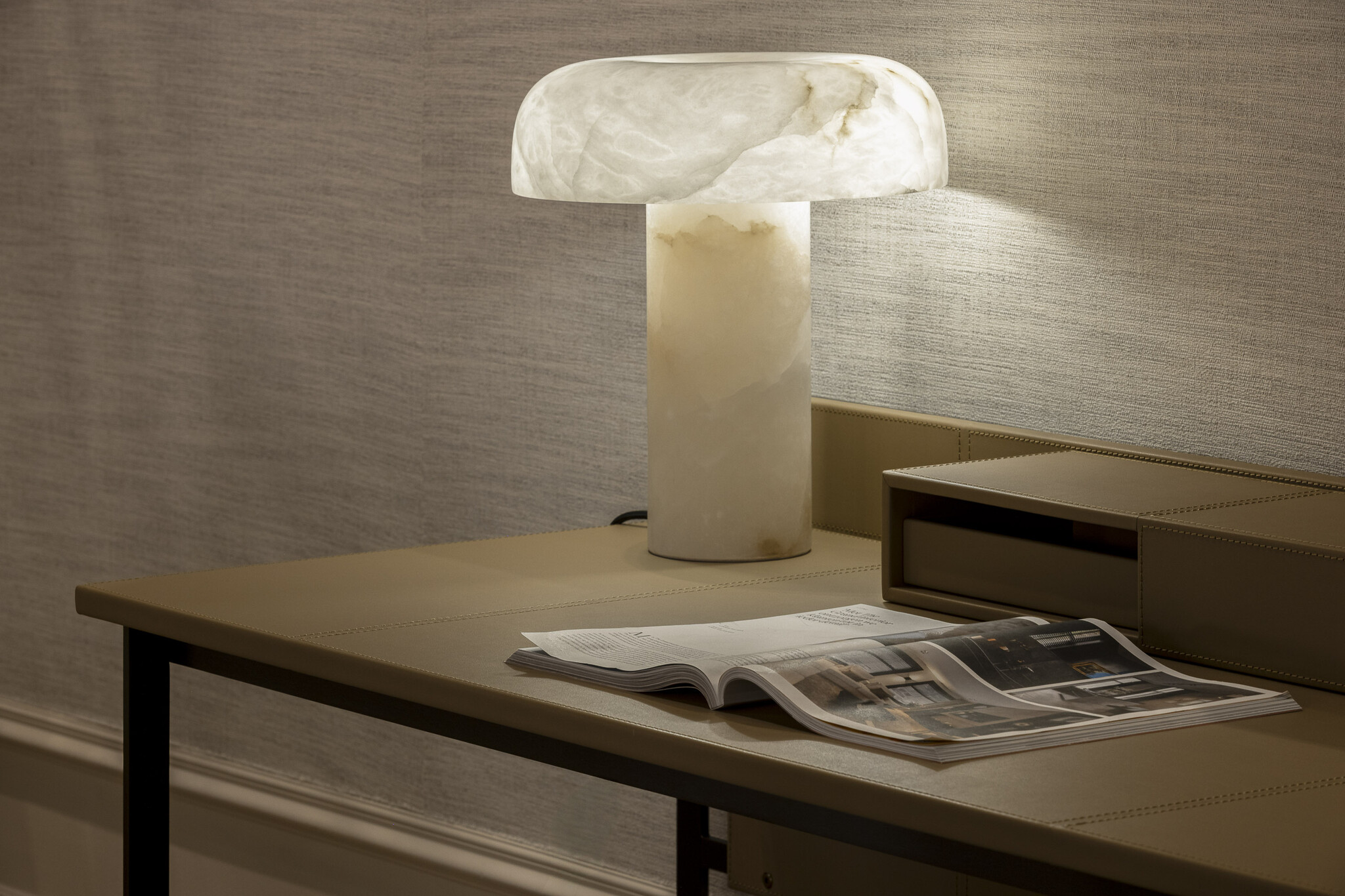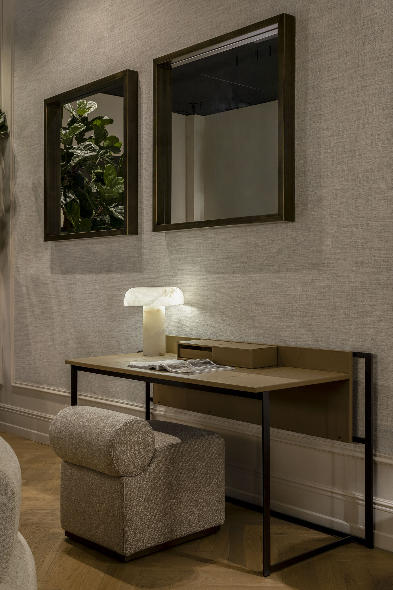Een stijlvol bureau in een warme beige tint, bekleed met microleer en fijn patchwork. Een echte blikvanger met een luxueuze uitstraling.